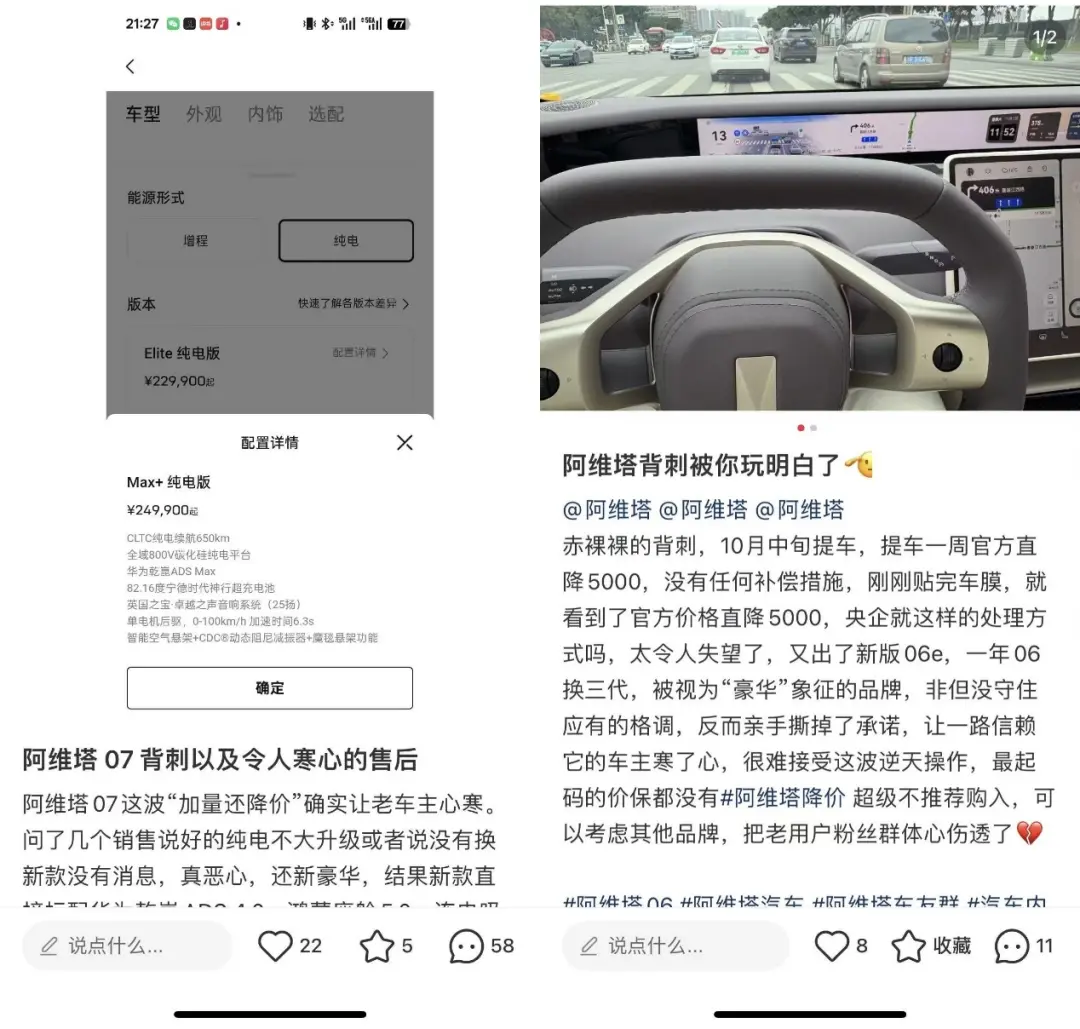 踏入11月,更多車主在社交平臺吐槽被阿維塔的“降價增配”背刺,比如提車阿維塔06還不到半月,品牌方就降價;阿維塔06一年換三代,存在明顯的“降價增配”操作。